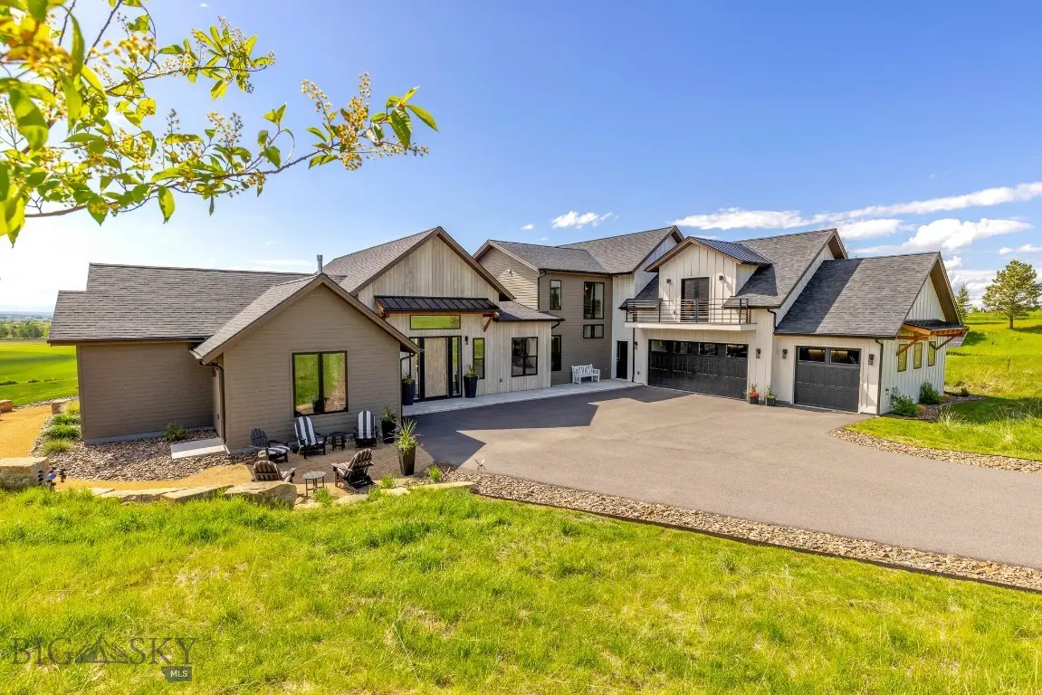 Views, views, views. Minutes from downtown Bozeman, situated on a bluff overlooking a Zen Garden-like sod farm and the East Gallatin River at the base of the Bridger Range with spectacular, uninterrupted views of all the mountain ranges bordering the Gallatin Valley from every window. Step through the grand entryway and take in spectacular views of the Spanish Peaks and Tobacco Roots. Flooded with natural light, this beautifully crafted custom home offers warmth, luxury, and Montana elegance with wide-plank wood flooring, sleek finishes, and a spacious, modern layout. The open-concept living space features 13’ ceilings, anchored by a dramatic fireplace, a stylish bar, generous windows, and multiple expansive glass doors connected to a nearly 100-foot partially covered patio. The manicured backyard and patio capture the sweeping panoramic landscapes and breathtaking western sunsets. A front crushed granite patio offers unobstructed Bridger views, creating the perfect outdoor retreat. A chef’s kitchen equipped with Thermador appliances, a 10’ quartz island, and European-style cabinetry. A massive butler’s pantry adds storage and prep space complete with a sink, and room for a second fridge or wine cabinet. Five bedrooms offer spacious comfort and privacy. The main-level primary suite includes a spa-like bath with heated floors, dual-head shower, soaking tub, floating vanities, and a large walk-in closet with custom cabinetry. Private patio access and a secluded hot tub area complete this retreat. Adjacent to the primary is a large dedicated home office with an additional private entrance. At the opposite end of the main-floor lies a junior suite with an ensuite bath, walk-in closet, and private patio access—perfect for guests or multi-generational living. Upstairs features three more spacious bedrooms with walk-in closets and mountain views, including one with an ensuite bath. The fifth bedroom can work as an additional window filled, corner office with stunning views. A large bonus room opens to a balcony, ideal for a theater, gym, or game room. Other highlights include an oversized mudroom, quartz counters, bedroom blackout blinds, fire sprinklers, fiber optic internet, and a heated 3-car garage with built-ins and attic storage. Located in Springhill Reserve with 49 acres of open space, 2.7 miles of trails, and just 1 mile from the recreational amenities of Riverside Country Club. Upscale Montana living, perfectly balanced between privacy and convenience.