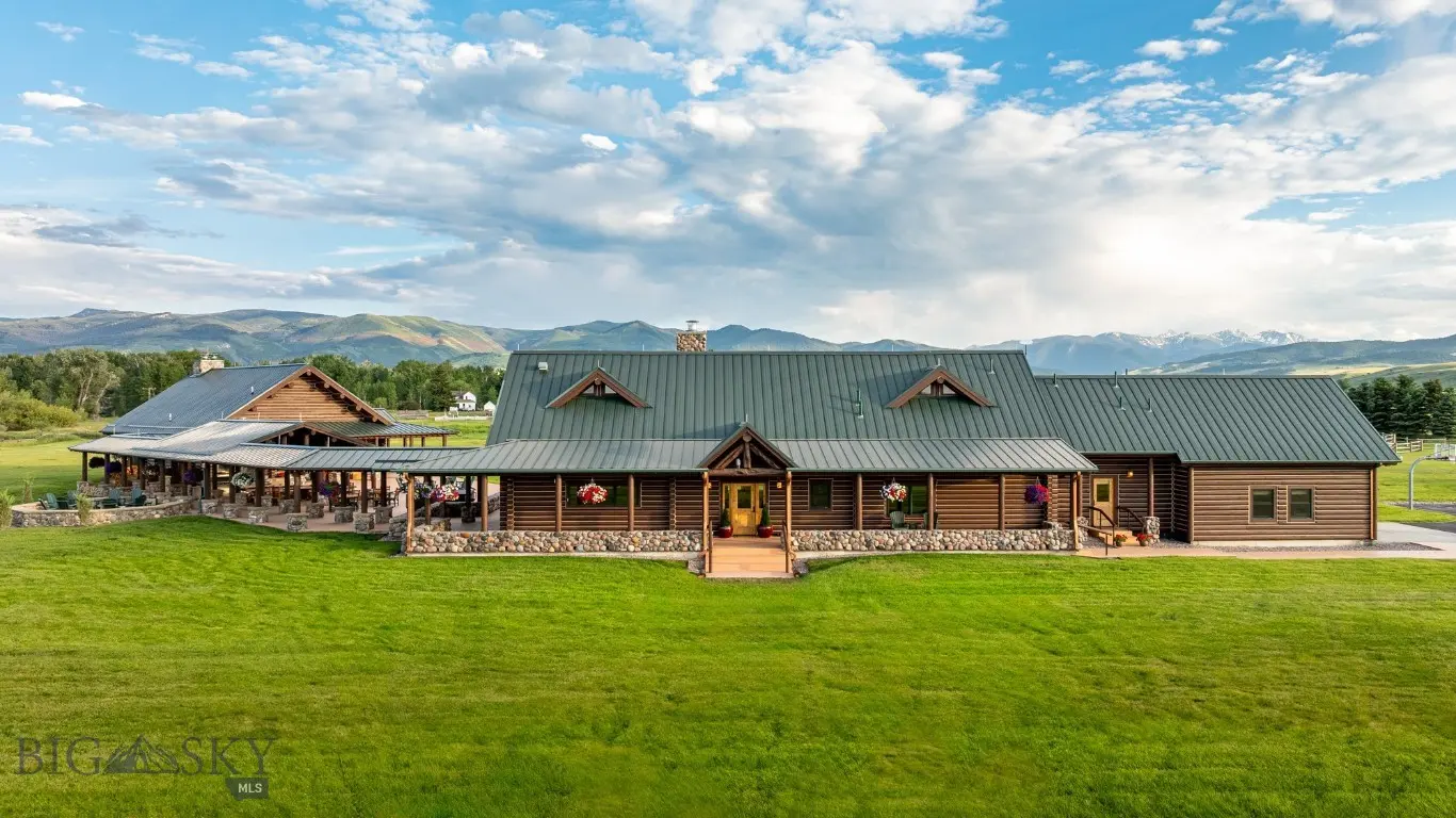A Rare Montana Riverfront & Equestrian Legacy on the West Gallatin River. Framed by panoramic views from the Spanish Peaks to the Bridger Mountains, this extraordinary estate spans 3 individually deeded parcels that straddle both sides of the West Gallatin River—offering unmatched privacy & direct access to blue-ribbon trout waters. World-class fishing on the property is paired with equestrian excellence: 3 round pens, fenced pastures & level ground ideal for rodeo, polo, or private training. This recreational sanctuary is just minutes from downtown Bozeman, the airport, Yellowstone & Big Sky Ski Resort. At its heart is an exceptionally crafted custom log home—a true MT masterpiece blending timeless design & rustic sophistication. The main residence showcases a dramatic two-story wall of windows with southern Spanish Peak views, 6 bedrooms, 7 total bathrooms & a large private office or 6th bedroom with handcrafted finishing throughout including a soaring river rock fireplace anchoring the great room, offering warmth & comfort after long days outdoors. A timbered breezeway connects to an expansive 2,000+SF entertainment center with its own floor-to-ceiling river rock fireplace, artifacts, game tables, full bar & kitchen—a gathering space built for lifelong memory-making. Between the main residence & entertainment center, a professional-grade kitchen with stainless appliances is flanked by 2 large fire pits & seating for 200+ guests, perfect for al fresco dining under the MT sky. A separate guest house offers 1 bed/1 bath with a fully equipped kitchen, living, dining, generous storage & oversized garage—ideal for visitors or a ranch manager. The estate also includes 3 heated garage bays, a fully equipped gym with bathroom, and a brand new pickleball court. Outdoor adventures call every season—fly fishing your private river, backcountry or resort skiing, hiking, biking, horseback riding &/or polo across vast pastures. Recreation is unmatched—Bridger Bowl lies 30 minutes north; Big Sky Resort, with the most skiable terrain in the U.S., is just 30 minutes south. With Yellowstone National Park, plus Bozeman’s dining, shopping & trail systems nearby, this estate offers both seclusion & easy access to life’s best. Offered fully furnished, including all farm & gym equipment, art & rare taxidermy, this once-in-a-generation estate is the perfect private river retreat, equestrian showcase, or multi-generational legacy—where river, mountains & Montana dreams converge.