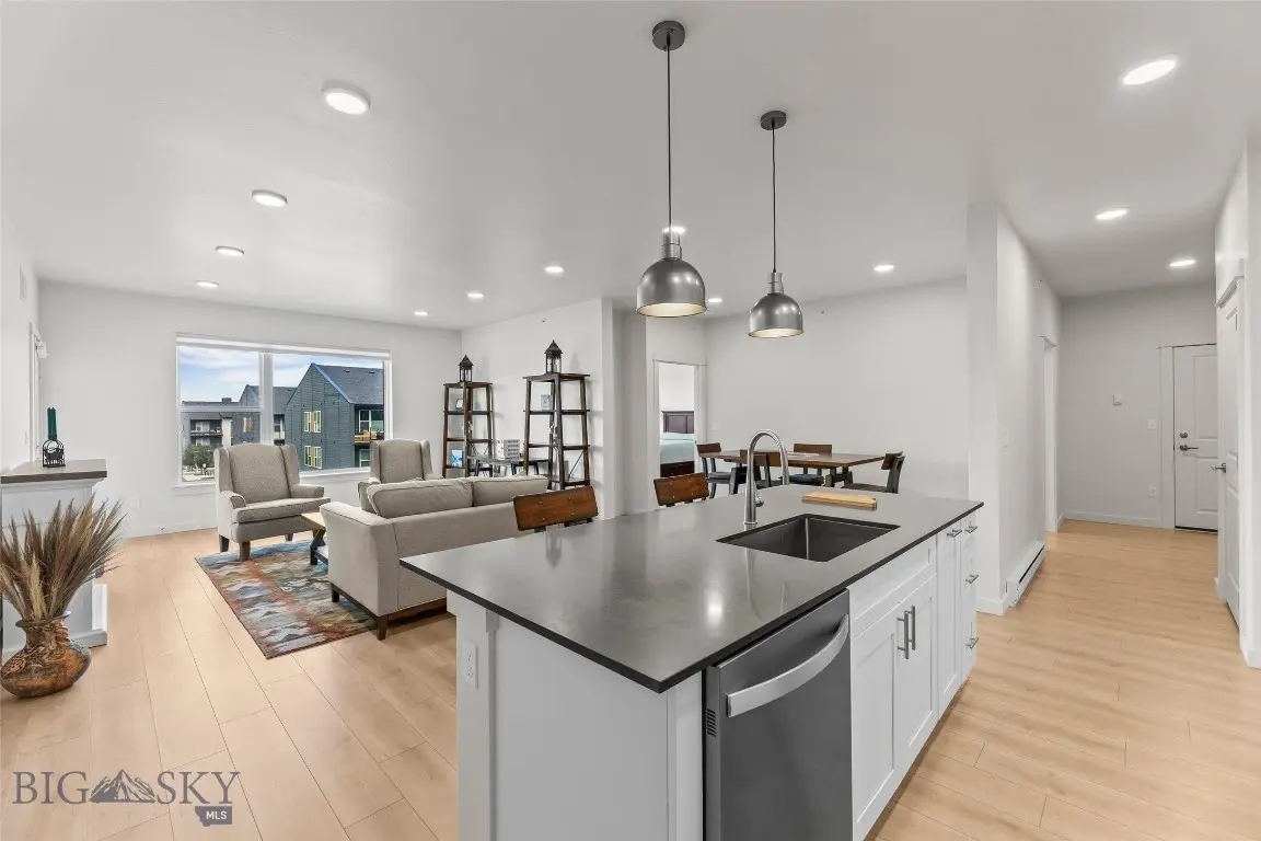 Welcome to Livingston, Montana where a coveted Flat at Yellowstone Bend is available! This well preserved 2 bedroom, 2 bath unit is located on the third floor at the far Northwestern edge of the Subdivision complex. Its positioning provides elevated views of Northeastern hills and dramatic sunsets. The kitchen is equipped with a large pantry, soft-close cabinetry and drawers, quartz countertops, like new stainless appliances, a timeless tile backsplash, and is centered at the heart of the living space. From the kitchen you can enjoy the open flow into the living area and either of the spacious bedrooms. Natural lighting floods in through the oversized windows and can be managed with top-down bottom-up blackout shades. The primary bedroom offers the luxury of space with increased square footage and a grand walk-in closet furnished with built-in shelving. The Primary bathroom was crafted with lovely tile and finished with glass doors. The covered balcony extends another opportunity for outdoor living. In addition to the abundant storage within, there is also an easily accessible storage locker and a 1 car garage unit. Unit # 77 can only be described as bijou living, brilliantly designed to maximize comfort and style. In addition to all the features this property offers, its location is minutes away from life’s necessities and entertainment in Livingston. Bozeman International airport is West 45 min.; Yellowstone is 1 hour South, - Furnishings may be purchased at an additional cost outside of closing. Call your agent today - Home is waiting.